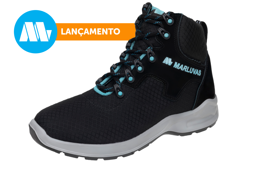 Calçado em microfibra nanopelle tipo nobuck, com forro sustentável, biqueira em polipropileno, palmilha SoftBedPU, TPU Plate para estabilidade e solado em PU bidensidade com novo design.