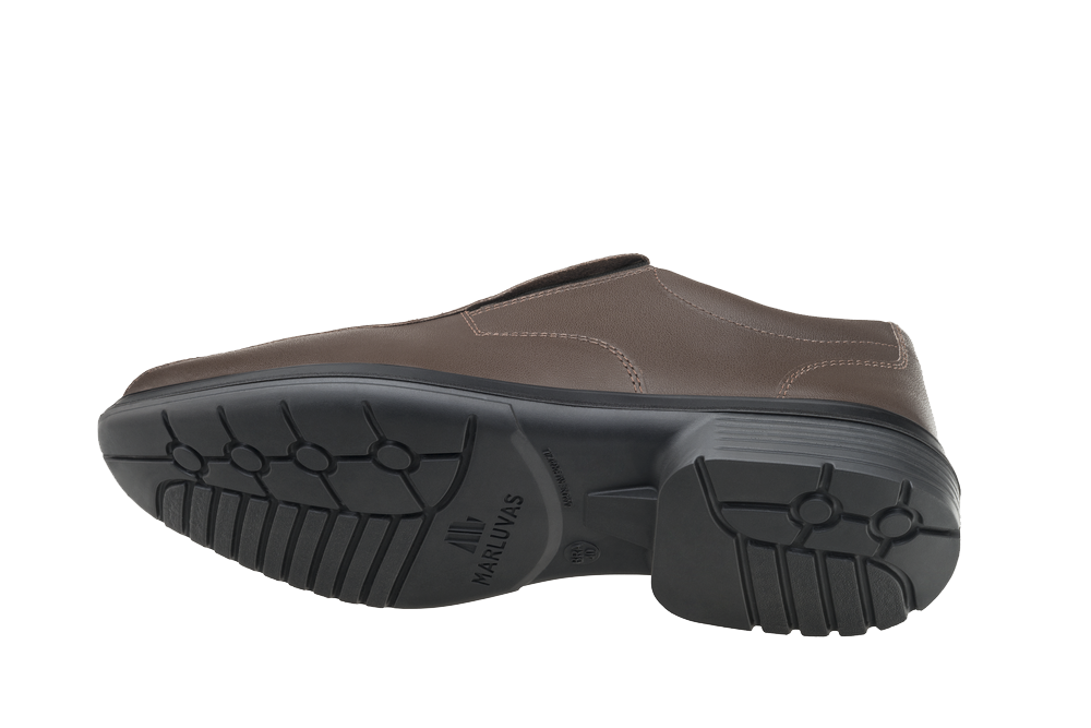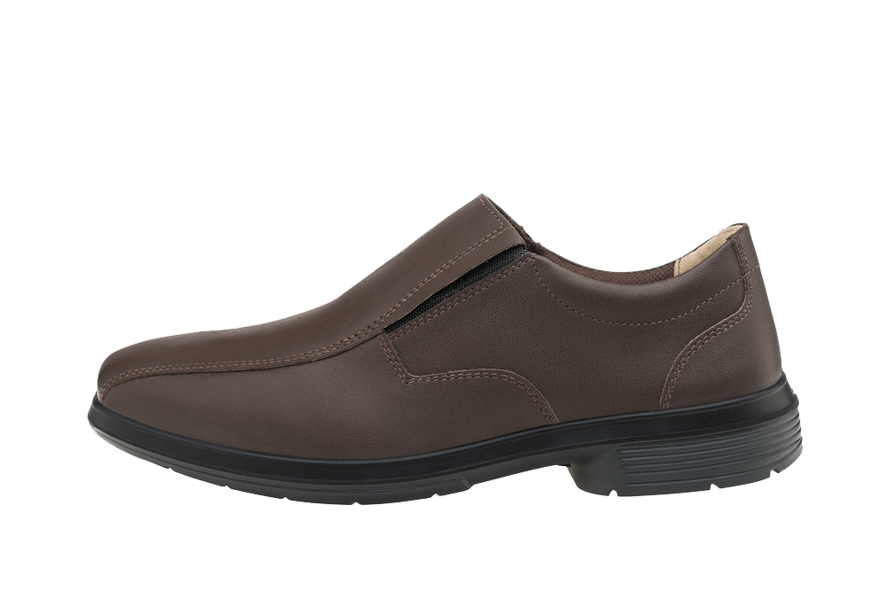 Sapato de couro na cor marrom para profissionais administrativos, militares ou de serviços gerais. O London Safe tem biqueira true line, colarinho soft acolchoado, fechamento em elástico nas laterais e palmilha de montagem em poliéster resinado, proporcionando segurança e estilo. O solado PU bidensidade com injeção direta no cabedal possibilita amortecimento e absorção de impactos. Além disso, este sapato social possui forração interna air Comfort e uma tecnologia antibacteriana que retém o suor dos pés.