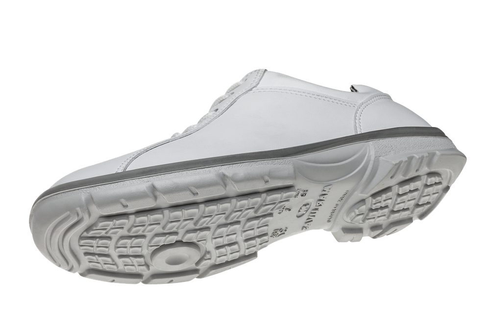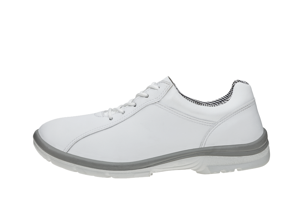 Tênis ocupacional confeccionado em couro baby na cor branca, ideal para áreas administrativas e áreas de serviços gerais. Este calçado apresenta colarinho soft acolchoado, fechamento em cadarço na parte da frente, biqueira true line, palmilha higiênica com proteção antibacteriana, solado ergonômico em PU bidensidade, injetado diretamente no cabedal, e palmilha de montagem em poliéster resinado. Além disso, o tênis é de fácil lavagem e 100% vegano.