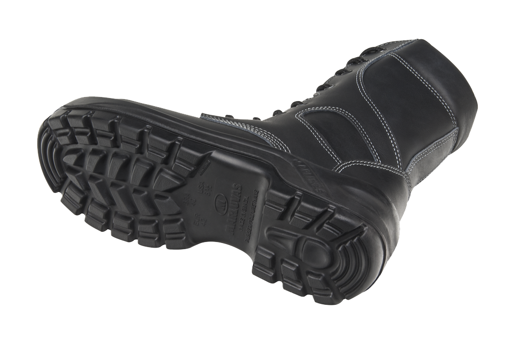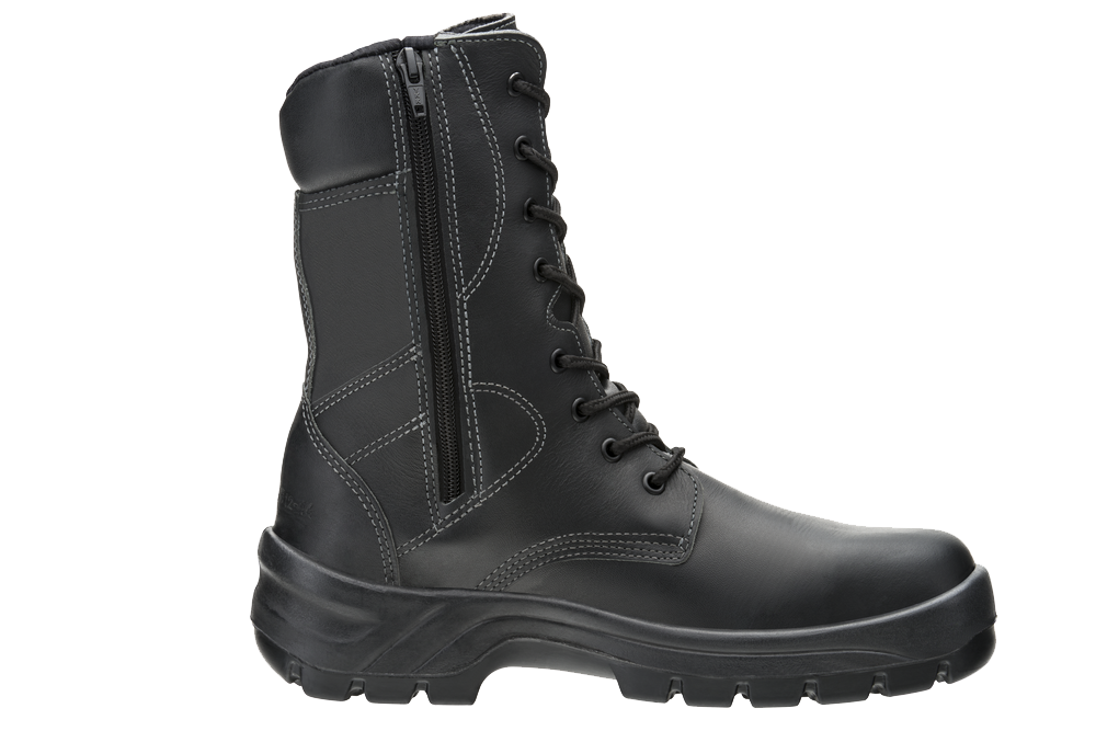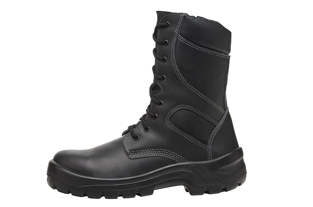 Bota de segurança militar e offshore, com proteção mecânica, confeccionada em couro vaqueta hidrofugado na cor preta, antichamas. Ela traz forração interna em tecnologia dryout water proof, membrana de PU 100% impermeável e transpirável, fechamento em cadarço na parte frontal e zíper nas laterais, sem componentes metálicos. A bota tem biqueira de composite leve e ultrarresistente. Este calçado apresenta solado bicomponente de poliuretano/borracha, resistente a 300°C por 1 minuto, injetado diretamente no cabedal, e palmilha de montagem, ideal para quem procura proteção contra perfuração, em tecido poliéster, que cobre 100% da planta dos pés. O calçado também possui resistência a penetração e absorção de água.